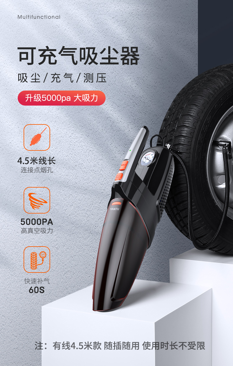 商品名称:沿途 车载吸尘器充气泵多功能 四合一汽车吸尘器有线12V车用 干湿两用 车内手持 汽车用品